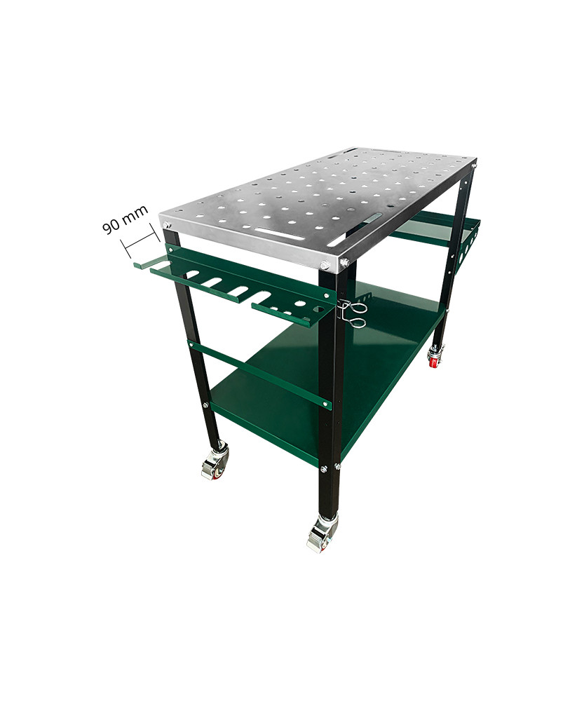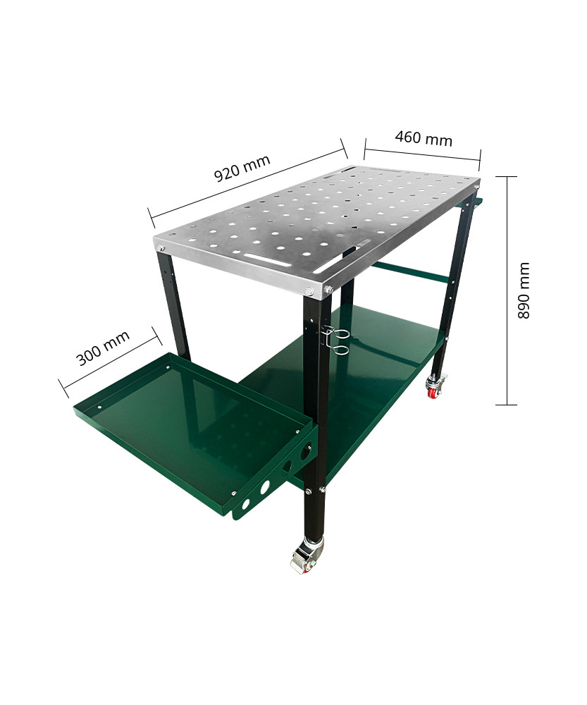 Masă de sudură practică, echipată cu o suprafață de lucru galvanizată, ideală pentru utilizare mobilă în ateliere și garaje.